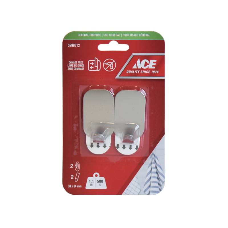 ACE REMOVABLE ADHESIVE HOOKS 0.5KG (1.1LBS) CAPACITY SS 2PK