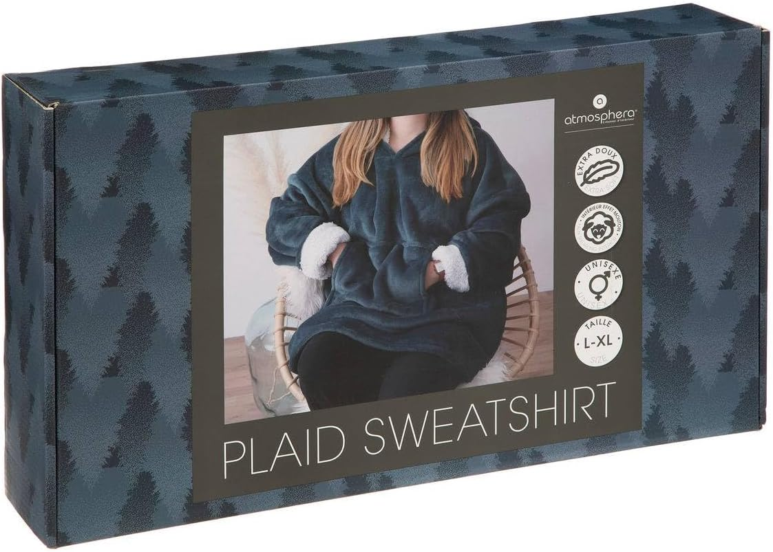 The Atmosphera Flannel Blanket Sweatshirt Hooded in Aegean Blue (L–XL) combines the warmth of a blanket with the comfort of a sweatshirt for ultimate relaxation. Measuring 85 × 118 cm with long sleeves and weighing 0.8 kg, it is crafted from 100% polyester outer fabric with a 100% polyester inner lining for a soft, cozy feel. Designed for easy care, it can be washed at 30°C and should not be bleached, tumble dried, or ironed. Perfect for lounging at home during cooler days, this hooded blanket sweatshirt offers comfort, practicality, and a stylish Aegean blue finish.