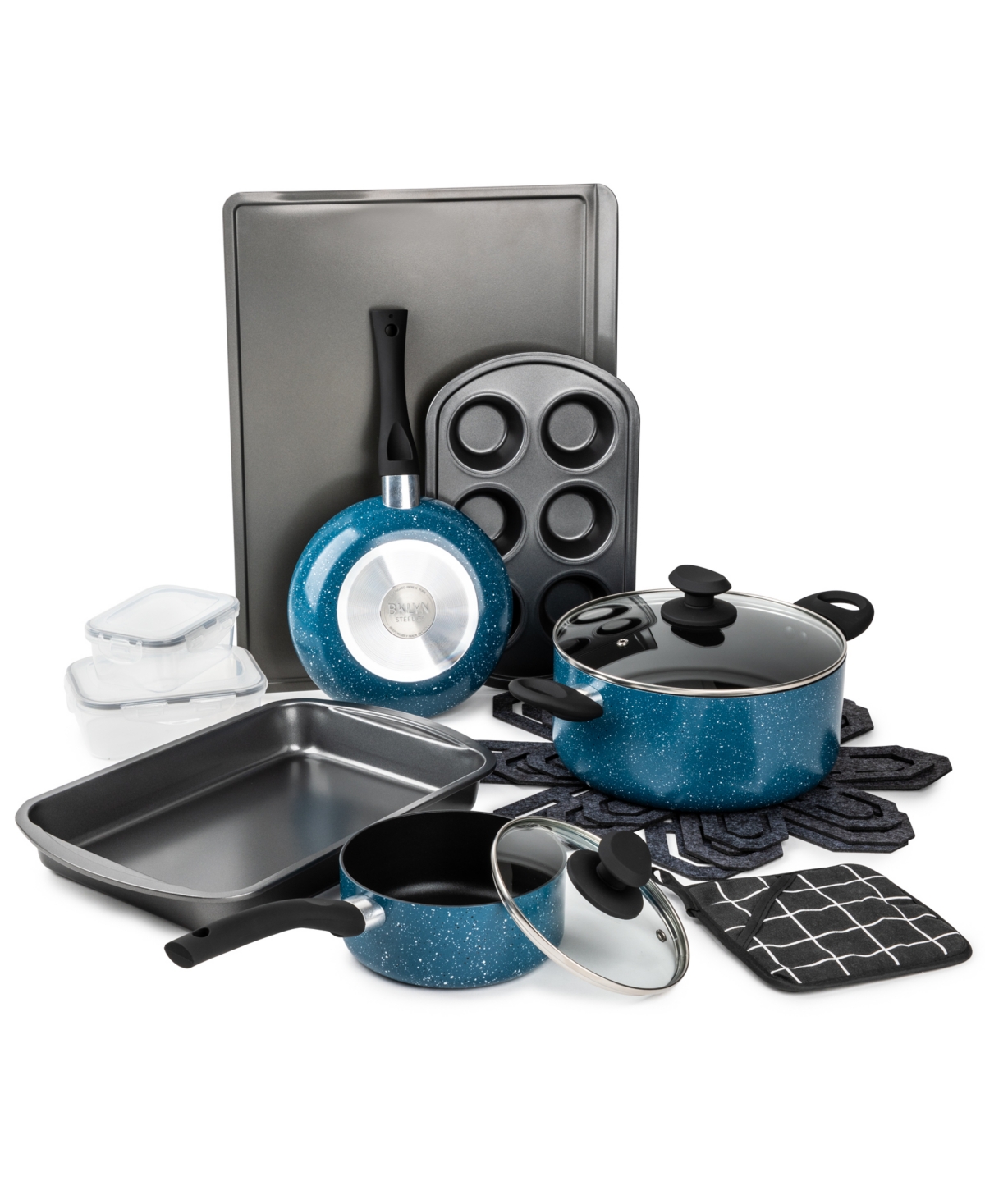 • Set Includes: 8" Fry Pan,1.5-Qt. Saucepan With Lid,5-Qt. Dutch Oven With Lid,8" X 8" Pot Holder,15" Cookie Sheet,9" X 13" Cake Pan,6-Cup Muffin Tin,Three Felt Cookware Protectors,17-Oz. Snap Container,28-Oz. Snap Container