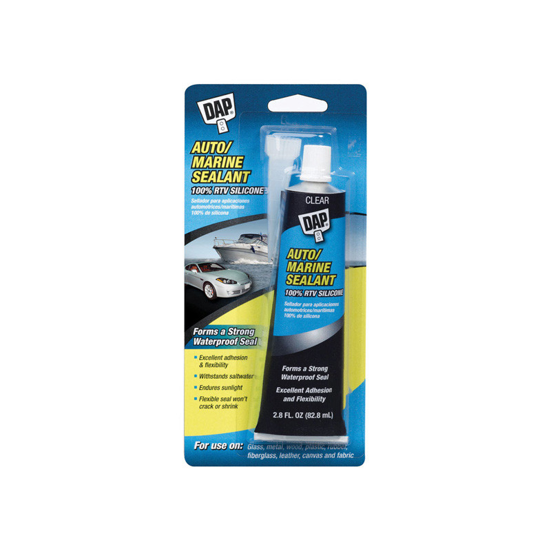 DAP Auto/Marine Sealant is a high-performance, single-component sealant made from 100 Percent RTV silicone rubber, that is designed for automotive and marine maintenance and other repair tasks. Versatile sealant forms a durable, 100 Percent waterproof seal that withstands saltwater, endures sunlight, and remains flexible and resilient, even in challenging conditions. It effectively resists cracking, shrinking, vibration, and the stresses of expansion and contraction. Once fully cured, it remains stable and unaffected by extreme temperatures ranging from -40 to 400 degrees Fahrenheit. Ideal for weatherproofing windshields/headlights/hatches, attaching trim/cleats/accessories, and repairing canvas and sailcloth. Meets ASTM C920, Class 25 standards. Sealant is suitable for both exterior and interior applications.