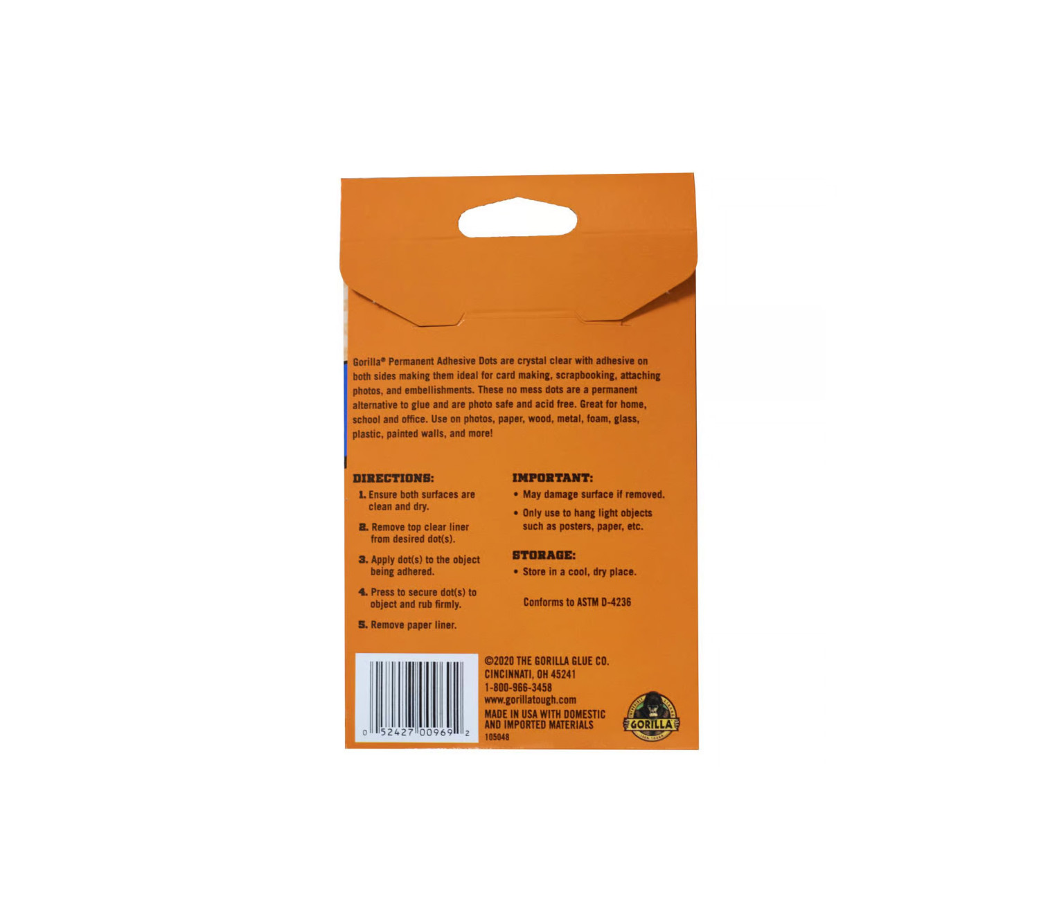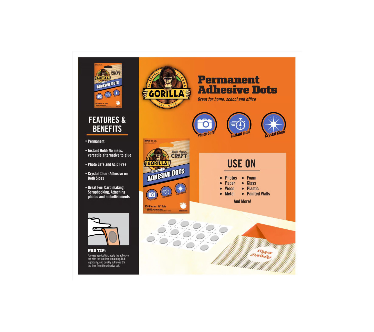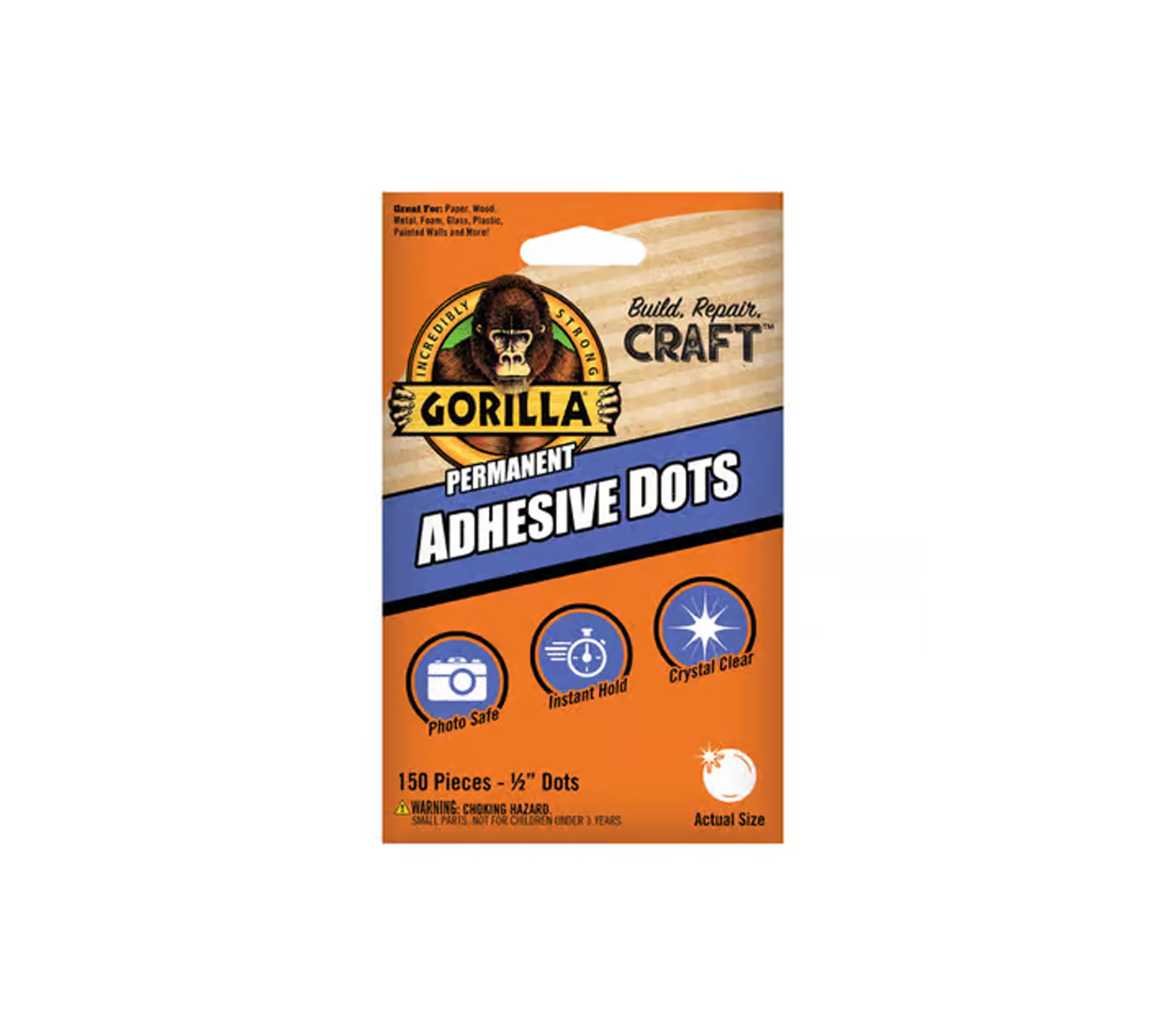 Gorilla Permanent Adhesive Dots are crystal clear with adhesive on both sides making them ideal for card making, scrapbooking, attaching photos and embellishments. These no mess dots are a permanent alternative to glue and are photo safe and acid free. Great for home, school and office. Use on photos, paper, wood, metal, foam, glass, plastic, painted walls and more.