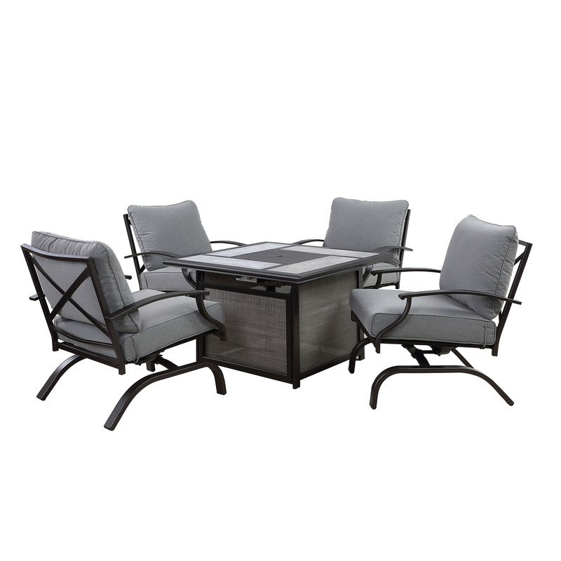 Set Includes: Four steel motion chairs with gray olefin cushions and a square fire pit table.