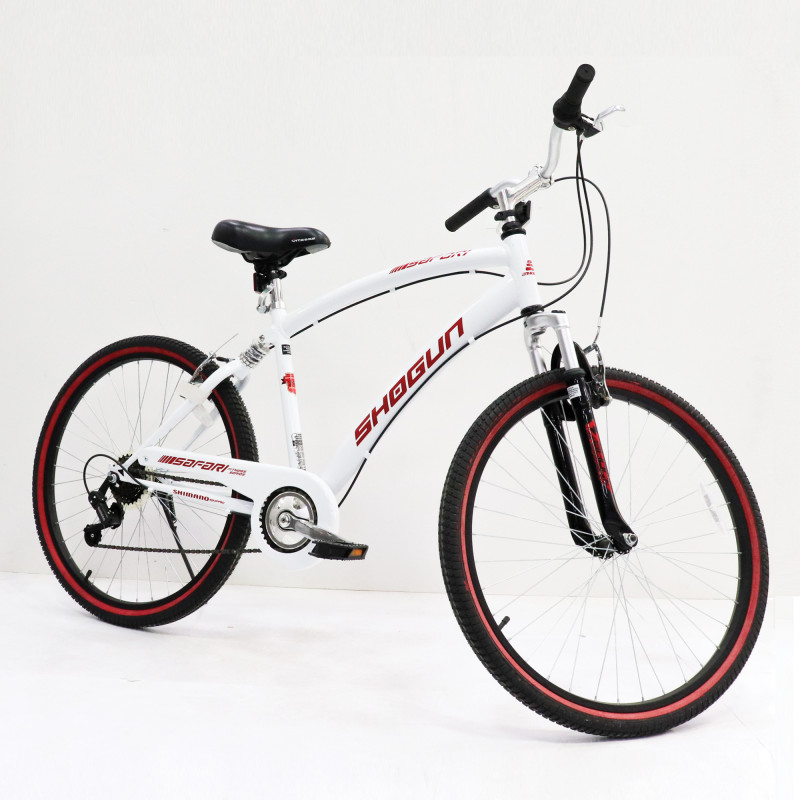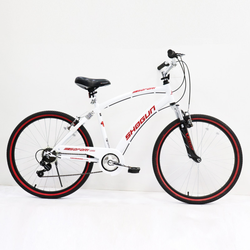 The Kent 26" Men's Shogun Safari Bike is a hybrid comfort bicycle designed for riders aged 13 and up, offering a smooth and controlled ride on both city streets and light off-road paths. Its lightweight aluminum dual suspension frame and front suspension fork effectively absorb shocks, ensuring comfort across various terrains.