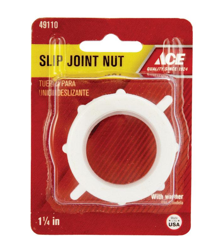The plastic slip joint nut with washer is used with 1-1/4 inch tubular piping. It features wing grips for easier hand tightening. Made of durable plastic.