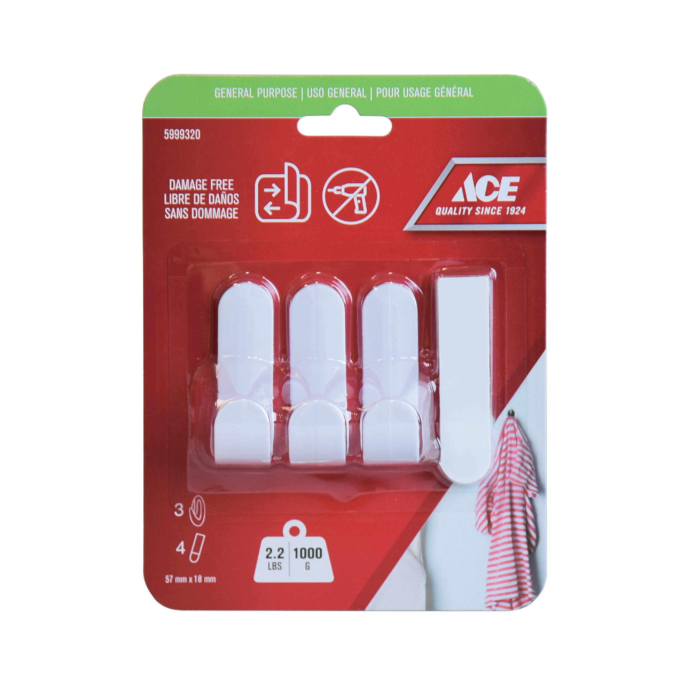 ACE REMOVABLE ADHESIVE HOOKS 1KG (2.2LBS) CAPACITY WHITE 3PK