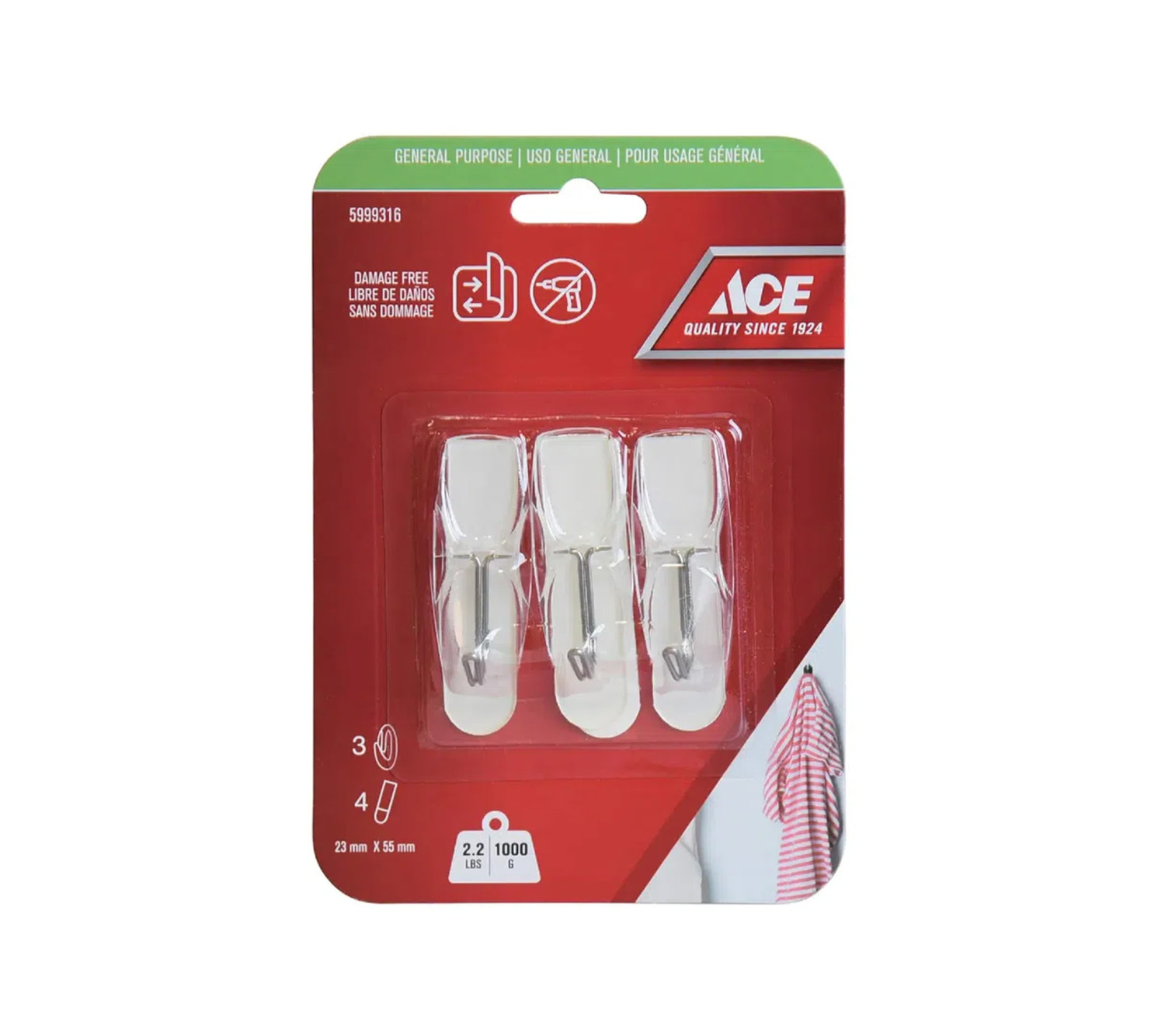 ACE Removable Adhesive Hooks 3Pk 1Kg (2.2Lbs) Capacity 2.3 cm x 5.5 cm (0.91 in X 2.17 in) Clear