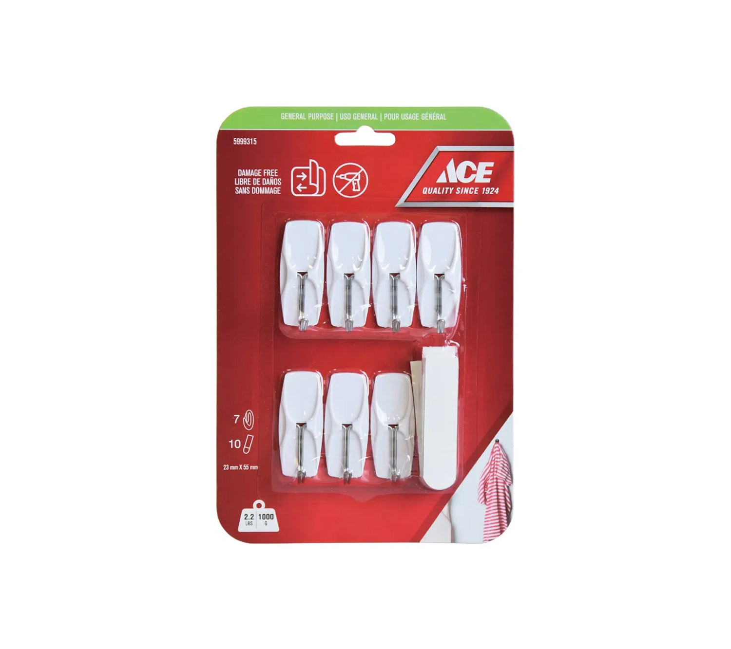 ACE Removable Adhesive Hooks 7 Pack and 10 Adhesive Strips 1Kg (2.2Lbs) Capacity White