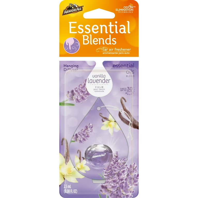 Introducing New Armor All Essential Blends Car Air Freshener Vanilla Lavender Hanging Diffuser. Unique, Innovative Design Hangs Like A Paper Card And Performs Like A Vent Clip To Create A Steady Fragrance Level For You And Your Car. Created With A Special Blend Of Essential Oils, Two Timeless Classics Come Together In This Pampering Aroma. A Soothing Blend Of Fresh Lavender And Cozy Vanilla, Combined With Blend Of Tangerine And Rosemary Calms Your Hectic Commute. Developed With Odor Elimination Technology, Odors Like Food, Pet And Smoke Are Destroyed Leaving Behind A Fresh Vanilla Lavender Fragrance That Lasts Up To 30 Days.