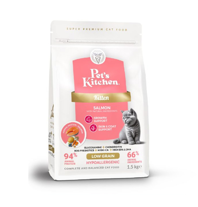 The 1500g (1.5kg) pack of Pet's Kitchen Salmon for Kittens offers a complete, scientifically balanced nutritional foundation for your pet’s most important growth phase. This larger size is ideal for daily feeding, ensuring your kitten receives consistent, super premium nutrition that is both hypoallergenic and low grain to minimize digestive sensitivities. With a robust 38% protein content derived largely from salmon, it supports lean muscle mass while providing essential fatty acids for internal wellness.