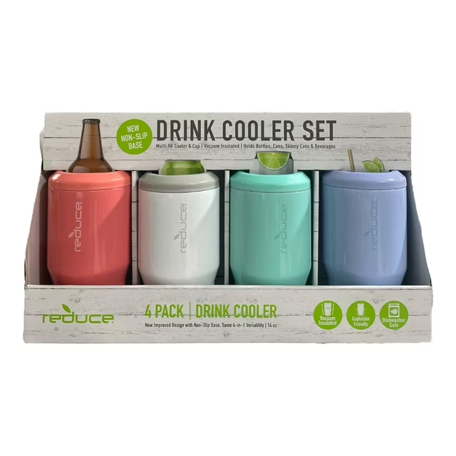 Slim cans standard cans bottles or mixed drinks—the Reduce® 4-in-1 Drink Coolers can do it all! Our patented design holds whatever you’re sipping—no adapters needed—while keeping it chill for up to four hours! This set comes with four vacuum-insulated Drink Coolers that feature a new non-slip base to prevent party fouls. Just twist off the lid drop in your favorite chilled beverage twist the lid back on and enjoy. Seamlessly versatile these Drink Coolers also convert to drinking cups for mixed drinks so you can switch up your drink without skipping a beat.
