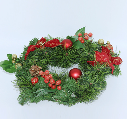 Constructed from high-quality, durable materials, the wreath features lush, realistic green foliage that replicates the natural look of pine branches. Each branch is carefully shaped to provide fullness and depth, giving the wreath a vibrant, lifelike appearance that enhances the festive spirit. Its compact yet dense design makes it an ideal decoration for homes, offices, and commercial spaces alike.