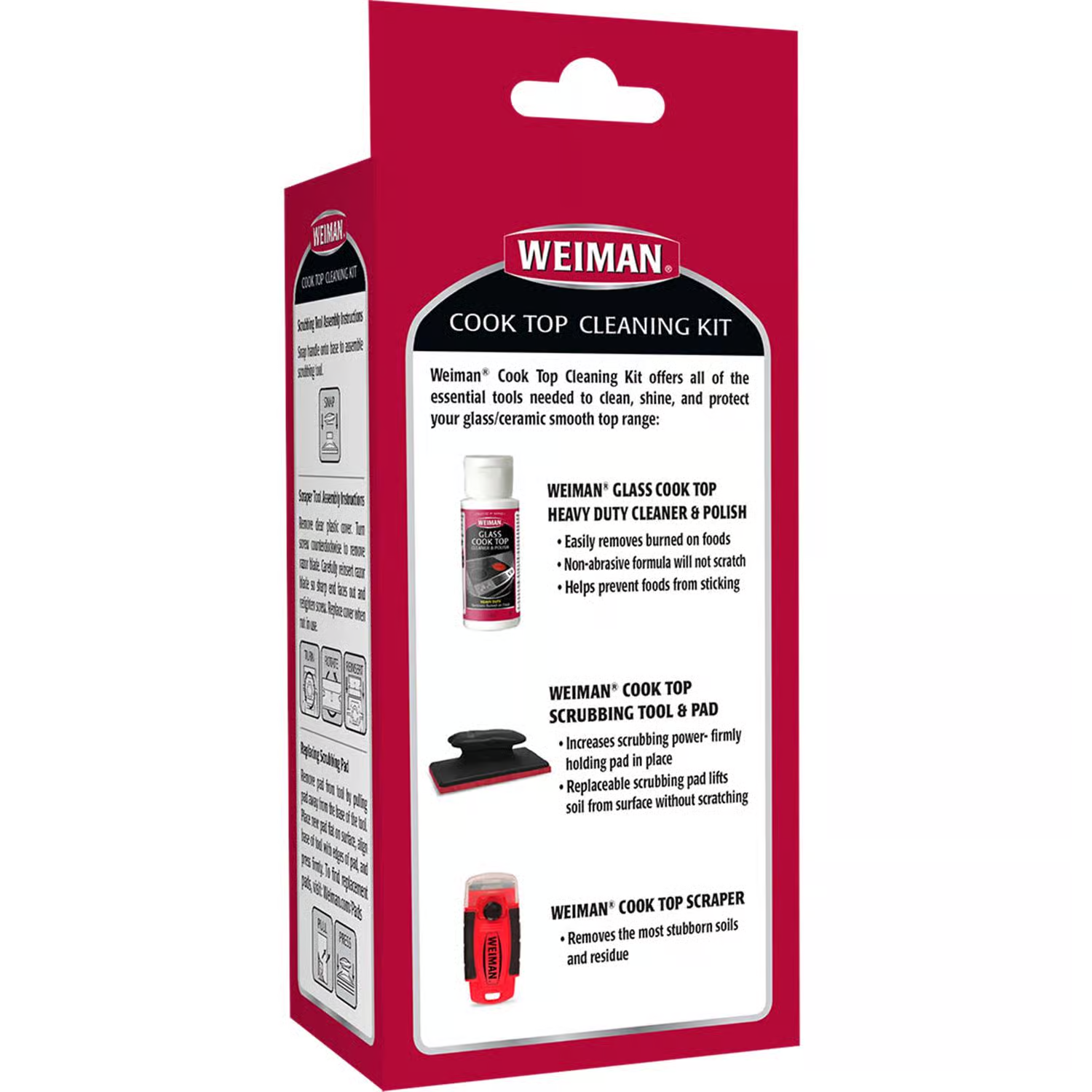 Get Weiman cook top heavy duty cleaner & polish along with the Weiman scrubbing pad, cleaning tool and Razor scraper in one simple kit. It has everything you need for stubborn food and residue removal. The complete cook top cleaning kit from Weiman offers all the essential tools for keeping your glass/ceramic smooth top range clean, shiny and protected. Specially formulated for glass/ ceramic smooth top ranges.