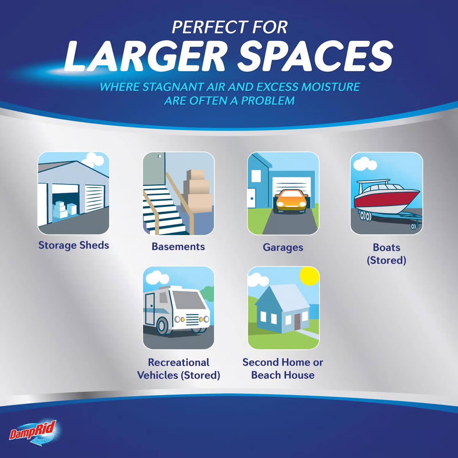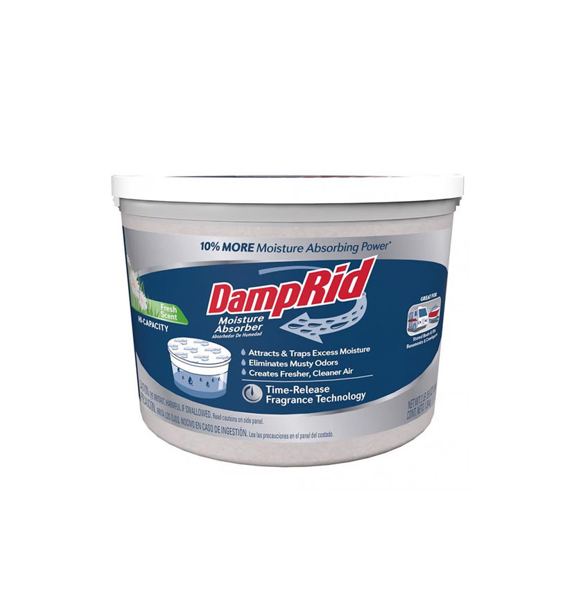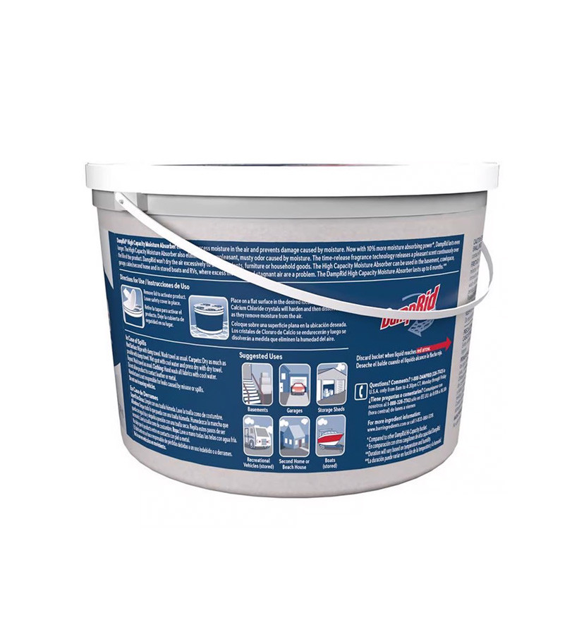 DampRid Hi-Capacity Moisture Absorber Buckets eliminate excess moisture from the air that can cause stale, musty odors. Furthermore, time-release fragrance technology continuously releases a pleasant scent over the life of the product. The hi-capacity design is perfect for large spaces - making it an ideal garage and basement odor eliminator. It's also great for crawl spaces, storage areas and stored RVs & boats. DampRid crystals absorb excess moisture to create and maintain the optimal humidity level wherever moisture is a problem. This dehumidifying bucket offers 10% more moisture absorbing power* and lasts up to 6 months depending on temperature and humidity. When the liquid in the bucket reaches the replacement indicator line, simply discard and replace. Keep out of reach of children. Do not use in moving vehicles. Do not allow product to contact leather or metal. (*Compared to other DampRid Hi-Capacity Bucket).