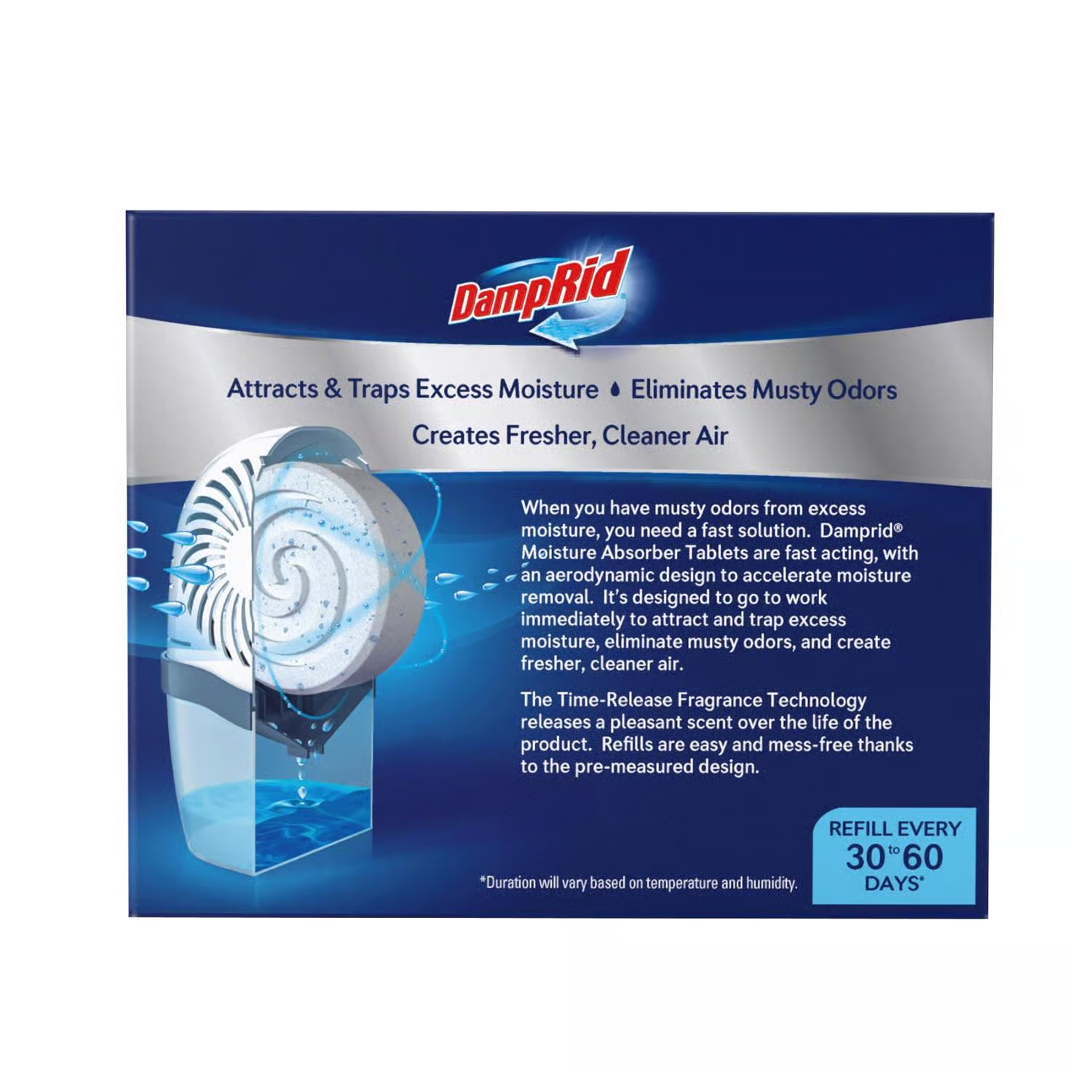 OUR FASTEST ACTING MOISTURE ABSORBER: DampRid Moisture Absorber Drop-In Tablets are designed to go to work immediately, attracting and trapping excess moisture, eliminating musty odors and creating cleaner, fresher air.
