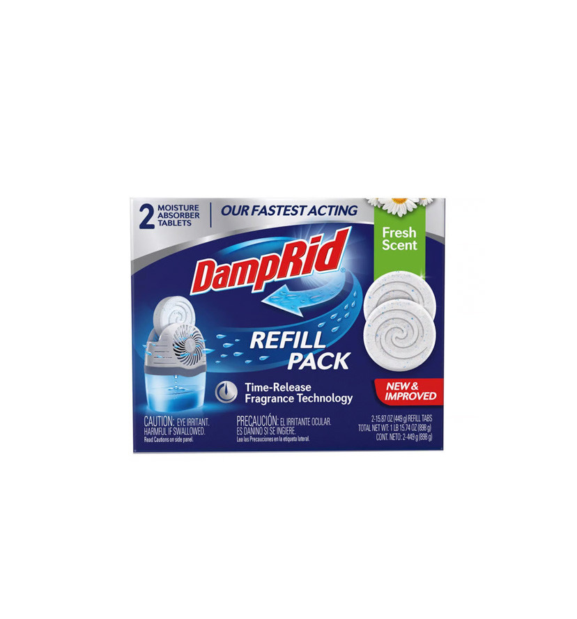 Don't just cover up odors, eliminate them with our fastest acting DampRid Moisture Absorber Drop-In Tablets. When paired with the Reusable Moisture Absorber Starter Kit, the aerodynamic tablets quickly attract and trap excess moisture and eliminate musty odors. The 360-degree ventilation system enhances airflow, making it our fastest acting moisture absorber. To use, simply insert an unwrapped tablet into the top of the moisture collection unit. DampRid tablets absorb excess moisture out of the air without use of electricity or batteries, while preventing moisture damage to your valuable possessions. Patented Time-Release Fragrance Technology releases a pleasant scent over the life of the product. Place these moisture absorbers in closets, bathrooms, laundry rooms, pantries, storage units, basements, garages, stored boats and RVS - anywhere damp, stagnant air is a problem.