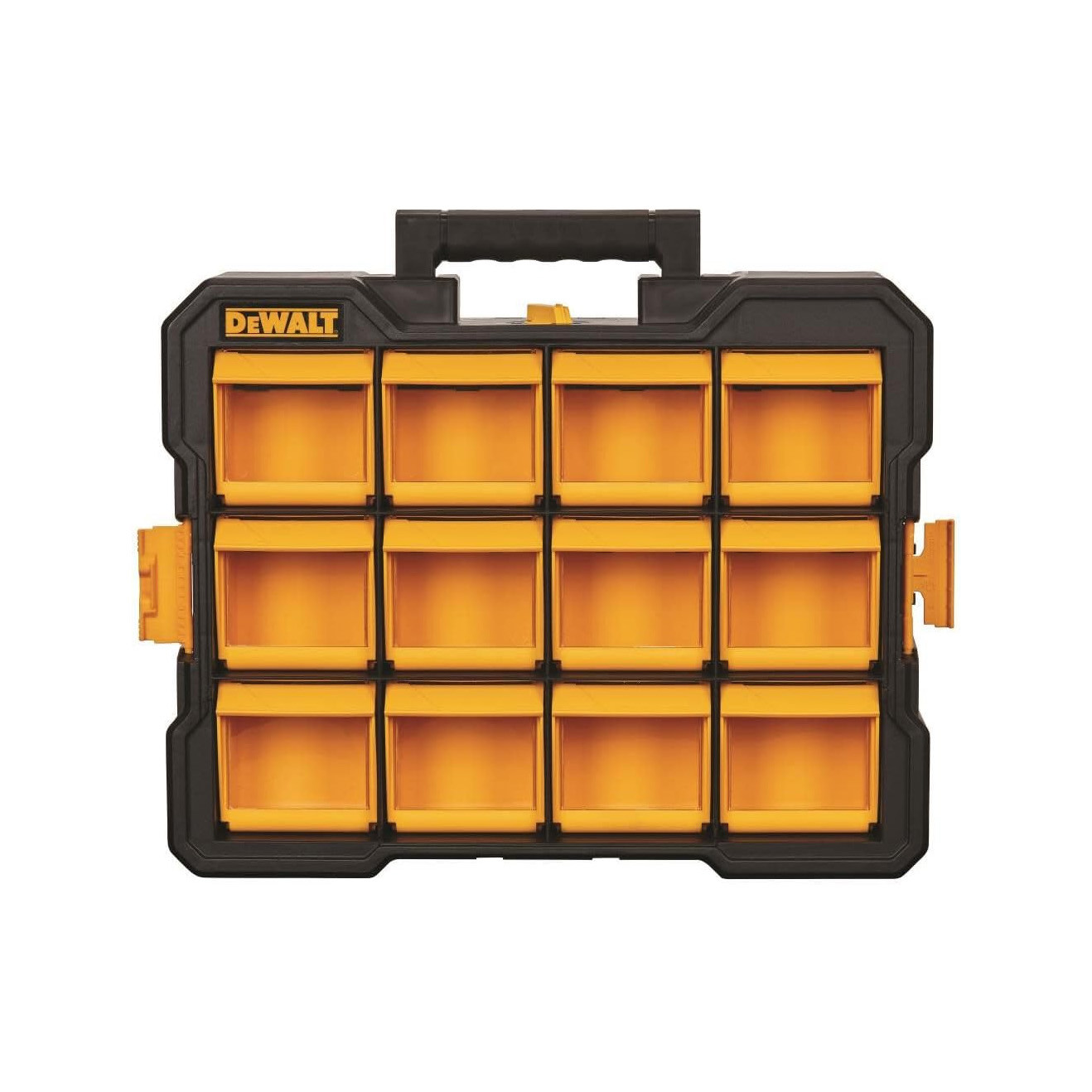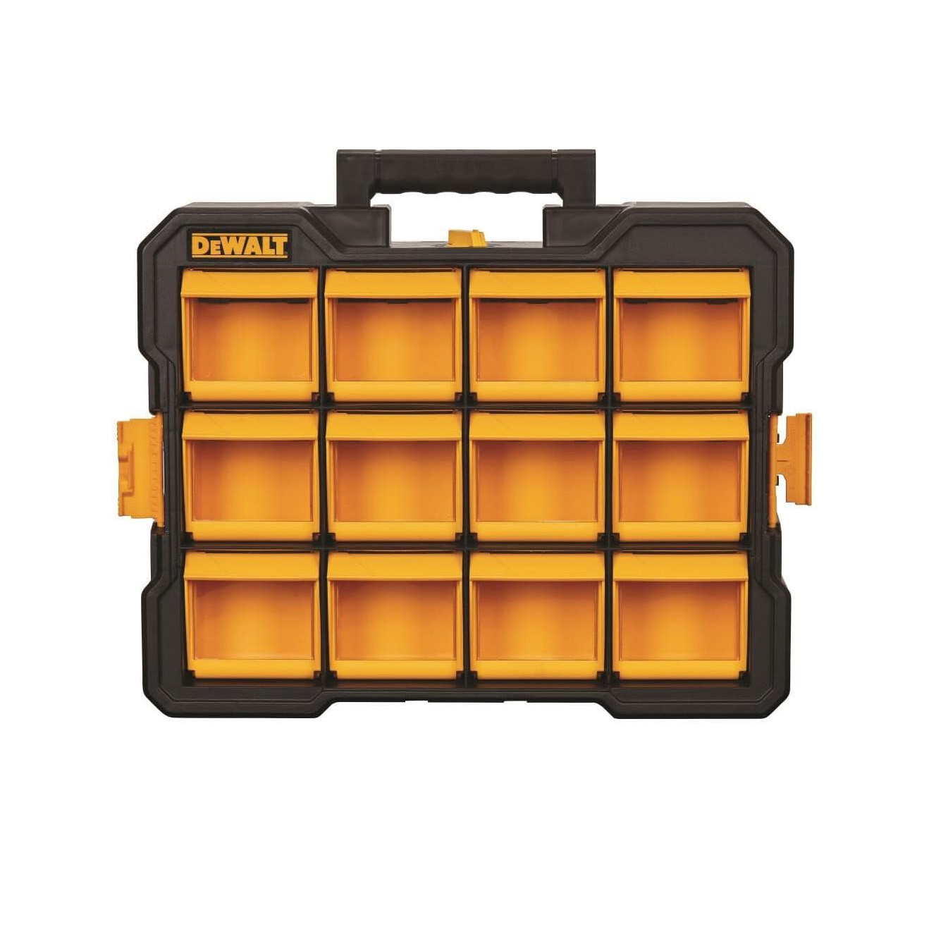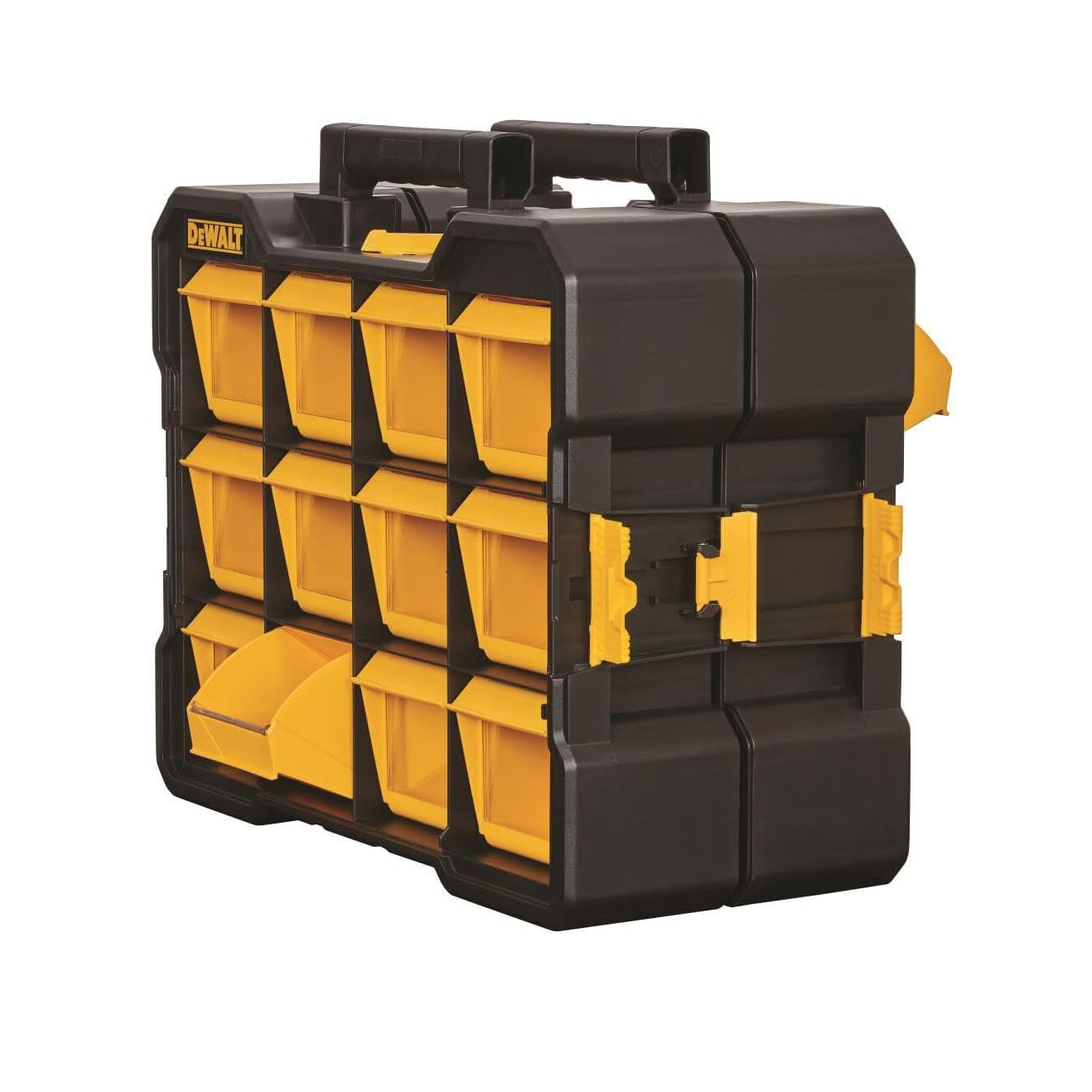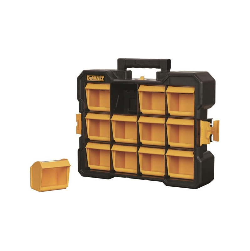 The DEWALT Flip Bin Organizer is a durable and versatile storage solution designed to keep small parts and accessories neatly organized and easily accessible. Featuring 12 removable bins with clear, impact-resistant fronts, it allows quick identification of contents without opening each bin. The secure locking latch keeps everything in place during transport, while the ergonomic handle ensures comfortable carrying. Its stackable design enables connection with other DEWALT organizers for customizable storage, and it can also be wall-mounted to save workspace. Ideal for professionals and DIY enthusiasts alike, it’s perfect for organizing screws, nails, bolts, and more.