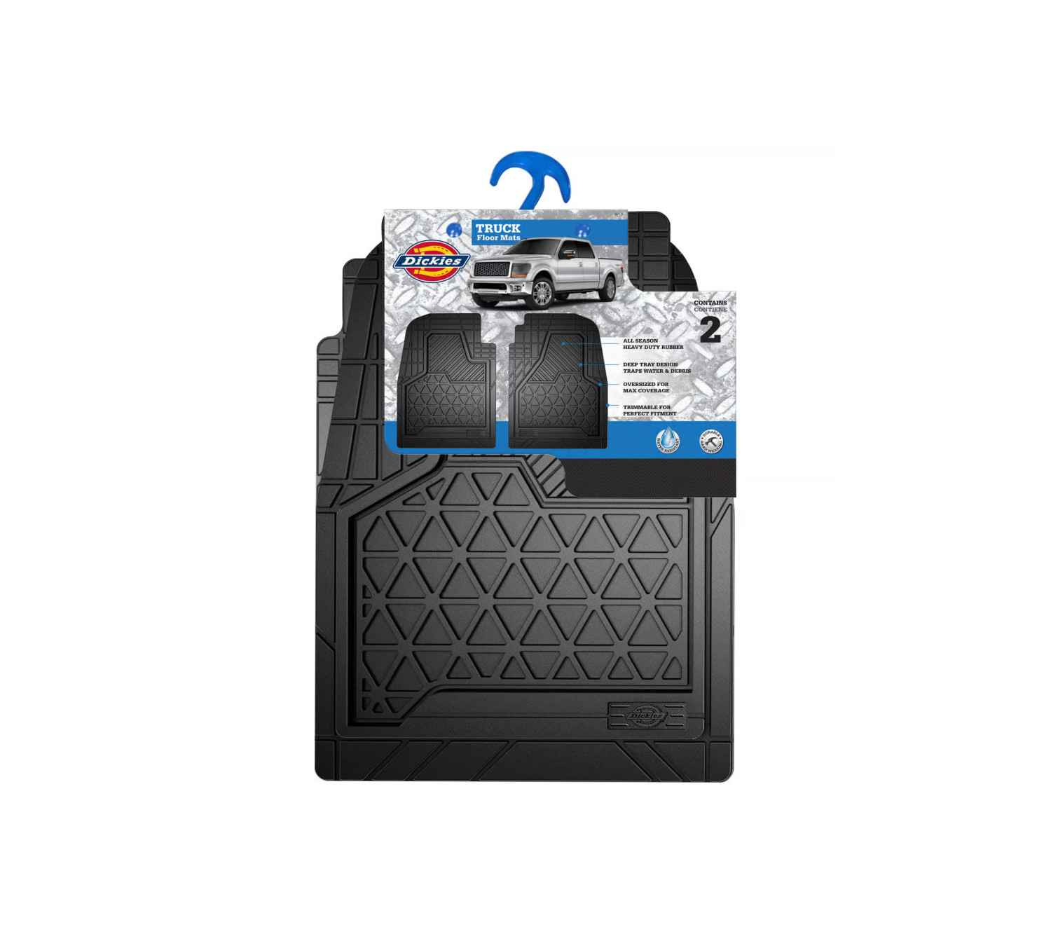 The Genuine Dickies Floor Mat Set have deeply sculpted channels and a full internal tray designed to trap water, road salt, mud and sand. This set of two floor mats are engineered to stay flexible in even the coldest of temperatures and feature a protective, non-stick finish to make cleanup quick and easy. To prevent the mats from shifting and moving, the Genuine Dickies 2 Piece Front Truck and SUV Universal Fit Floor Mat Set includes anti-skid nibs on the underside of the mat. The front mats are designed to provide maximum coverage of the vehicle's carpet, while providing safe clearance from the brake and gas peddles. Trim to fit cut lines are incorporated into the mat allowing customized fitment to your vehicle. The floor mats are designed with a universal fit application that makes fitment on trucks and sport utility vehicles simple and easy.