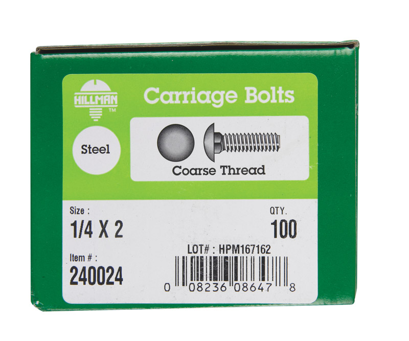 Hillman 1/4 In. Dia. X 2 In. L Zinc-Plated Steel Carriage Bolt 100 Pk