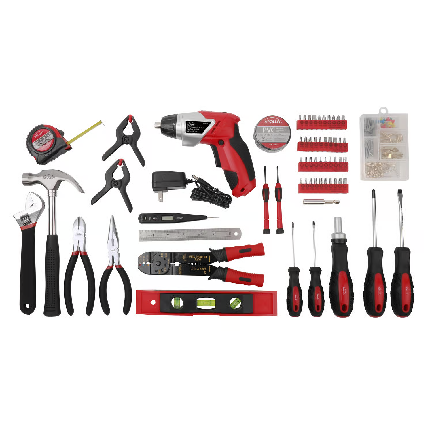 This new upgraded tool set has all the same features as our best-selling model, now with an improved cordless screwdriver that will have you ready for the widest range of home DIY and everyday maintenance and general tasks around the home, from assembling furniture, hanging pictures or performing basics repairs. This powerful cordless screwdriver with forward reverse mechanism allows for rapid tightening and loosening of screws. It features a bright LED to light up work areas. The power gauge lets you know when it is time to recharge. For a more convenient reach depending on the situation, the cordless screwdriver's head has a useful pivoting feature. Push a button and the head rotates from straight to right angle. The set includes tools carefully chosen for their usefulness in everyday household and DIY tasks, so you will always have the right tool for the job. A versatile 8 oz. claw hammer, an adjustable wrench for working with nuts and bolts, 6-inch long nose and 6-inch diagonal pliers for pulling, grabbing, holding and cutting wire, a ratcheting bit holder and 40 of the most commonly-used bits. The kit includes accessories to help you in your DIY and decorating tasks, such as a 100-piece wall hanging kit with its wide assortment of wires, pins hooks and nails. A magnetic level and a tape measure will ensure the position and angles of your frames and mirrors are perfect. We also included clamps, a wire stripper, electrical tape and a versatile selection of screwdrivers and bits. Tools are neatly stored in a sturdy case that keeps them secure, clean, organized and easy to find. The case is easy to carry with its built-in handle, your tool kit can come with you wherever it is needed.