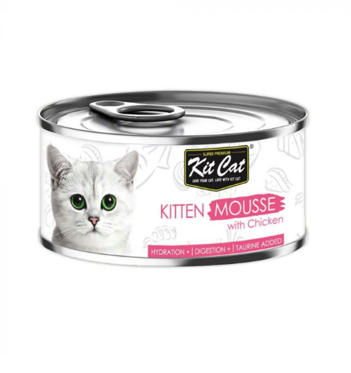 Kit Cat wet food was created by our nutritionists who are also cat lovers and made with the goodness of carefully selected natural ingredients which contains no added colours or preservatives. Our Kit Cat 100% grain free diet offers your cat a pH level balance wholesome nutrition to support a healthy lifestyle, reducing risk of kidney stones and urinary tract infection.Crafted with a smooth texture of deboned tuna with chicken topping, Kit Cat Tuna Mousse is made easier for your adults or senior cats for better digestion and hydration. Rest assured that your cats are kept hydrated at all times with this high moisture grain-free diet.In addition, this super premium diet contains taurine, an essential amino acid that is critical for normal heart and eye function for your cats.