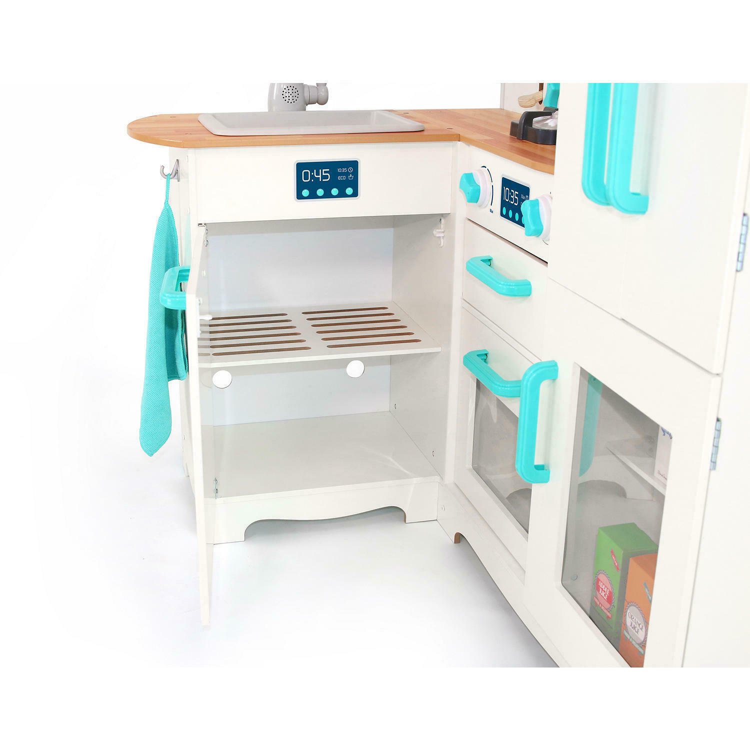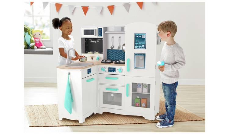 Interactive Design: Includes pretend stove, sink, and storage areas