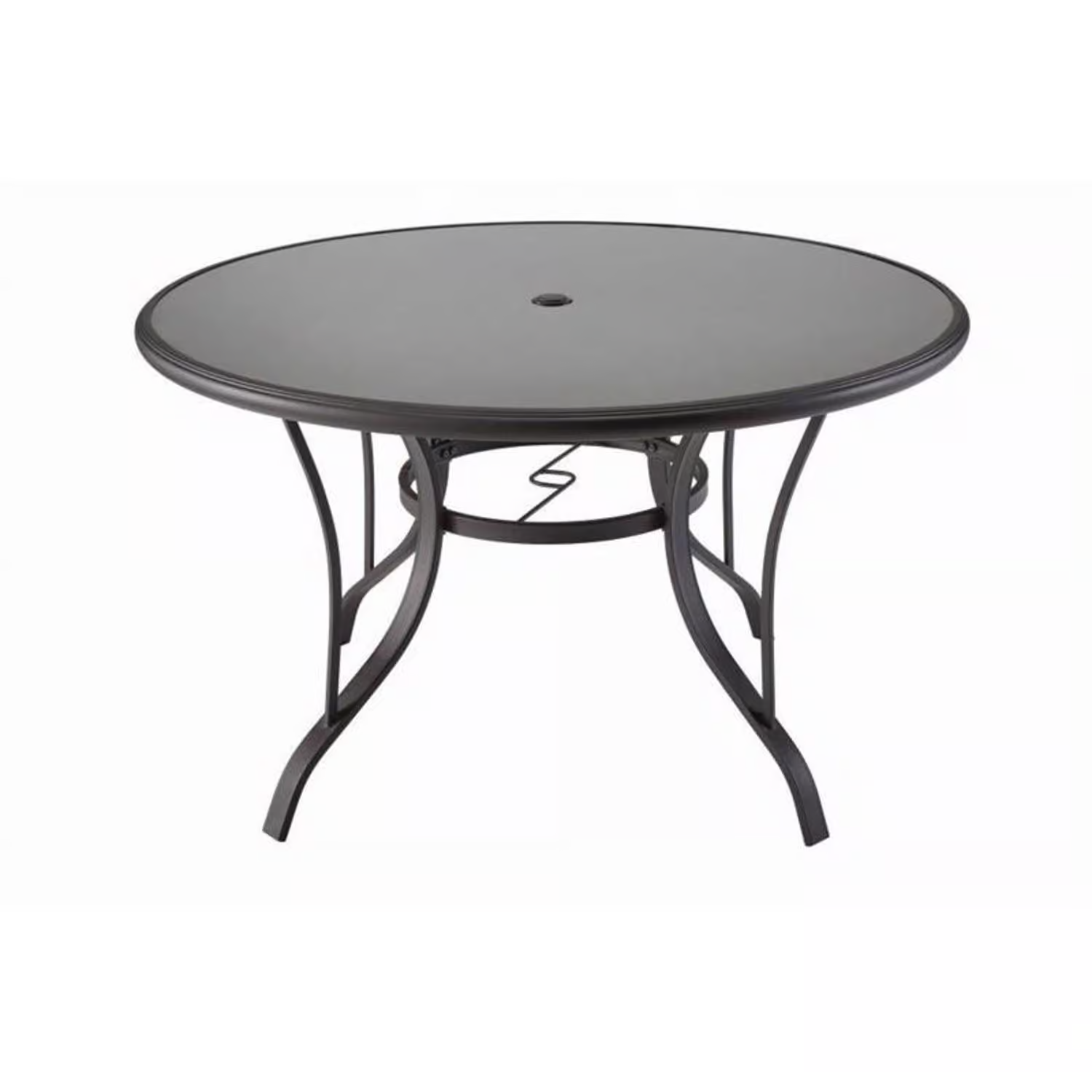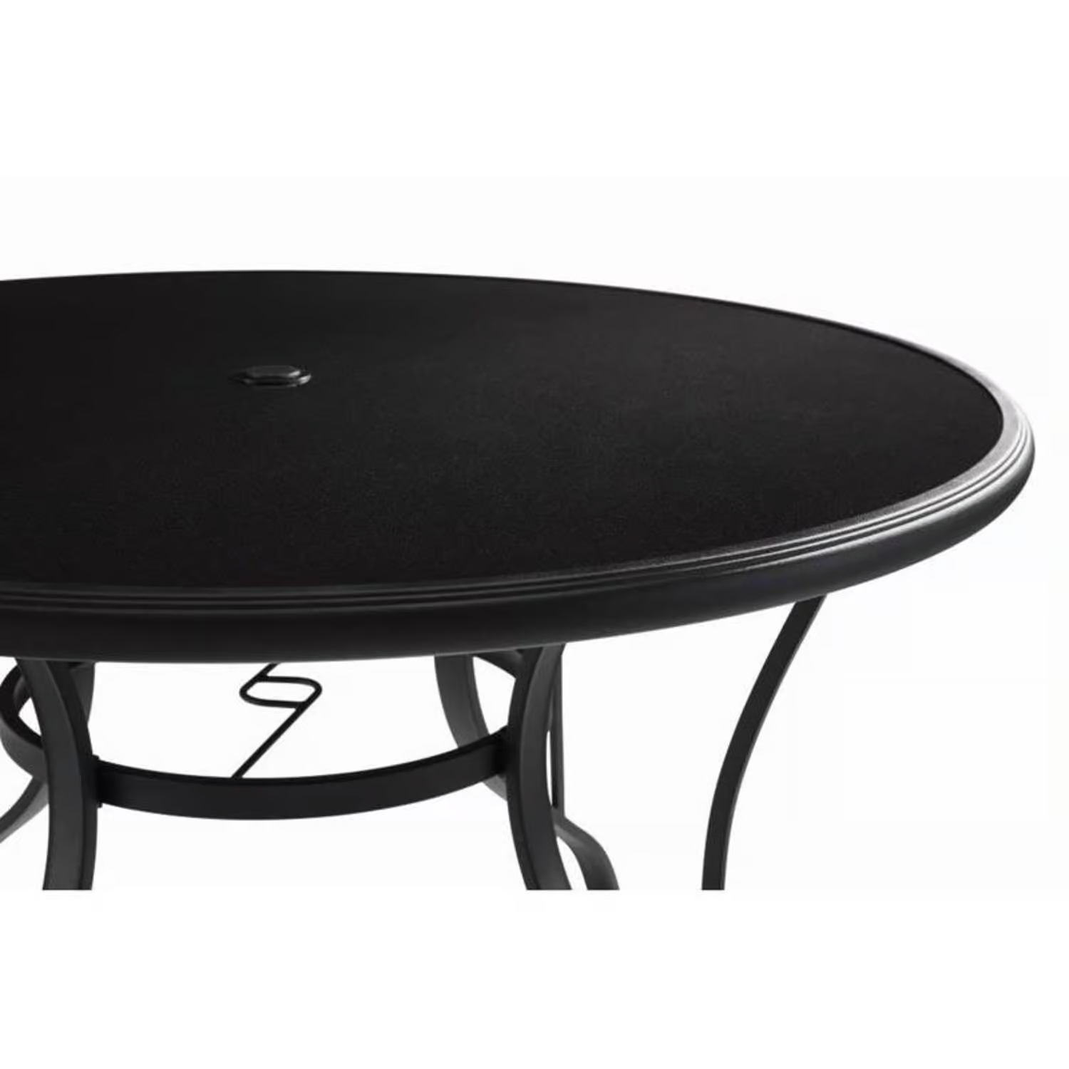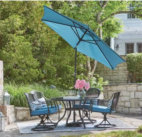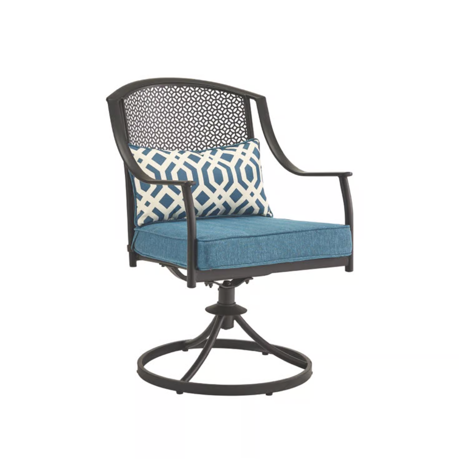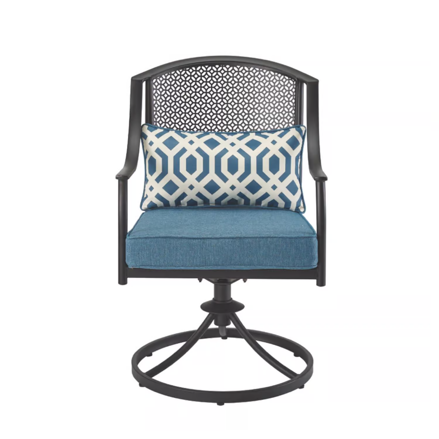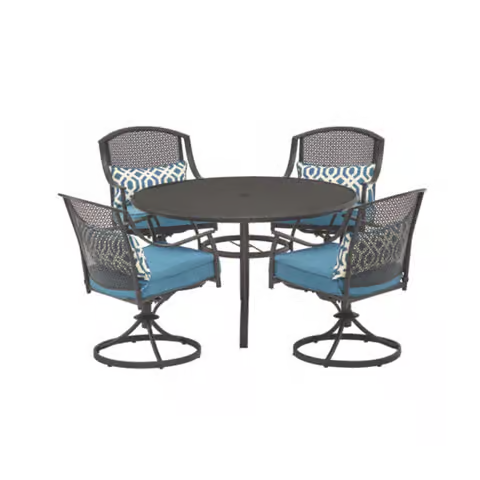 The Living Accents Cortland 5-Piece Black Steel Patio Set with Peacock Blue Cushions is a stylish and durable outdoor furniture set designed to enhance your patio or garden space. This set includes a round dining table and four matching chairs, all constructed from sturdy black steel. The chairs feature comfortable polyester cushions in a vibrant peacock blue color, adding a pop of color to your outdoor decor.