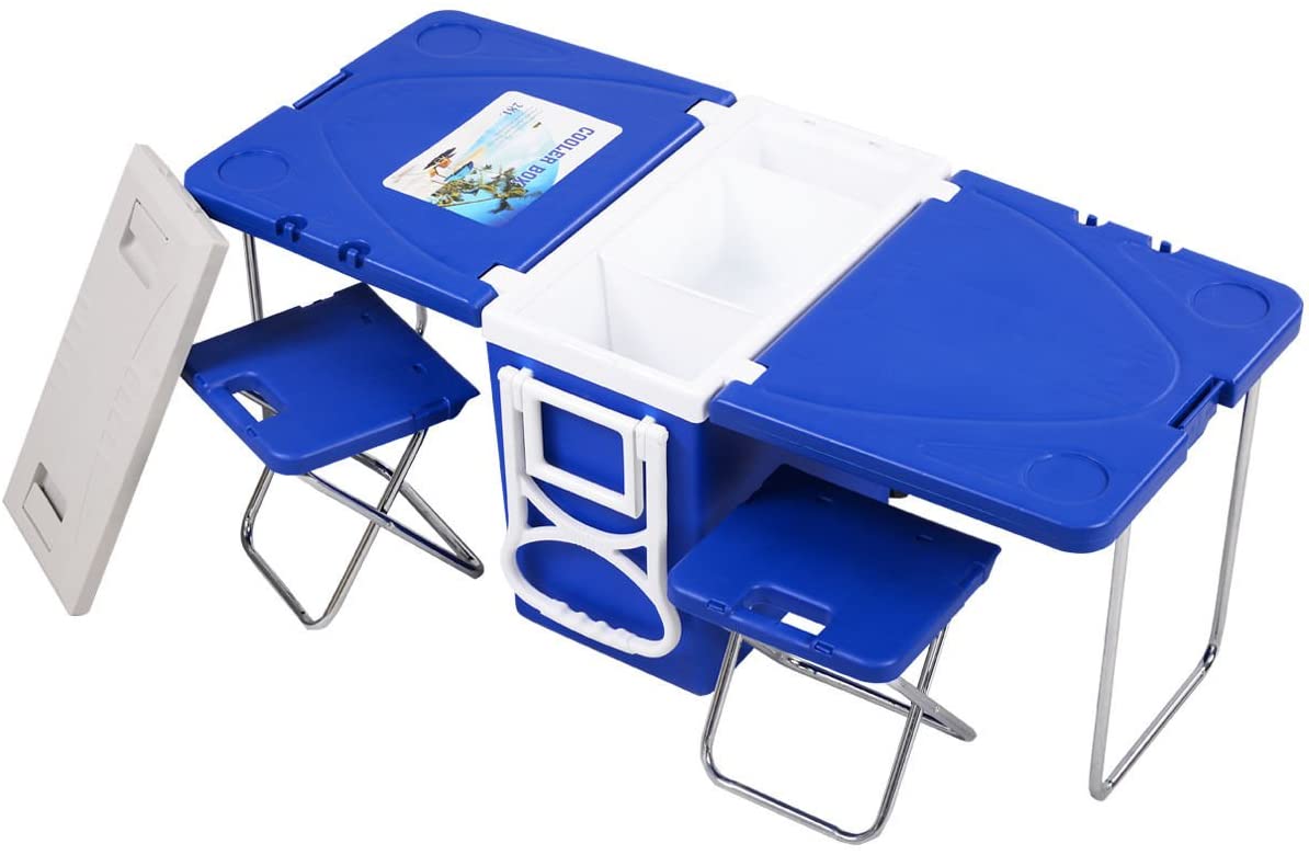 Multi Function Rolling Cooler Picnic Camping Outdoor W/Table & 2 Chairs - Blue