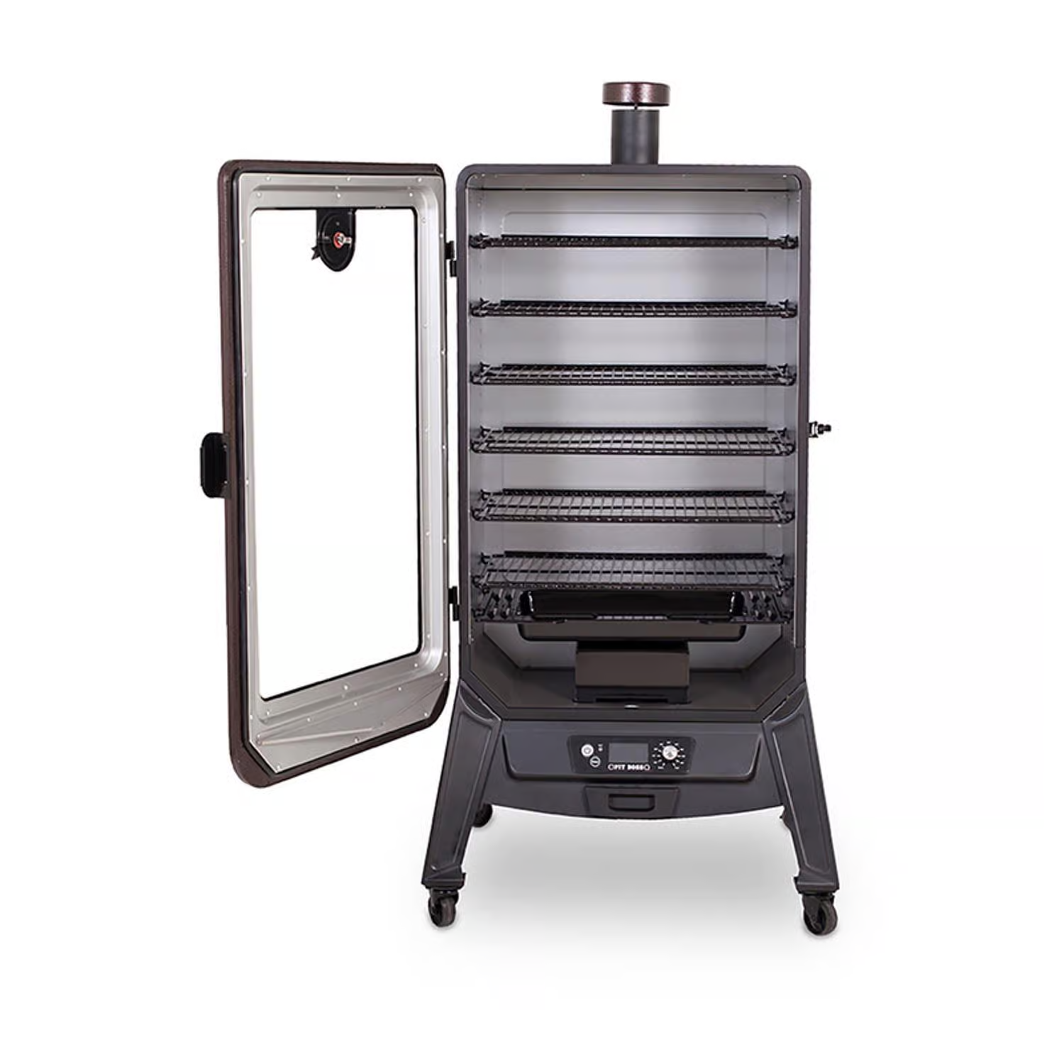 Innovation meets the outdoors with Pit Boss' all new 7 Series Vertical Pellet Smoker. Never has smoking been this versatile. The double walled insulation lets you smoke from 100 deg. F to temperatures reaching 420 deg. F, unlike any other smoker on the market today. The large front window eliminates the need for peek-a-boo cooking and its elevated frame makes transferring your meal from the smoker to the table a breeze. With the PB 7 Series Pellet Smoker there is no need to fret about cooking lengths - its 55 pound plus hopper allows you to cook for up to 24 hours Its sleek design is not only unique, it is also functional. The 7 Series Pellet Smoker features 1815 square inches of porcelain coated cooking racks, locking caster wheels, an easy to read digital controller and notable hammer tone copper finish. The multiple position racking system ensures you'll have enough room to smoke anything your heart (or stomach) desires.