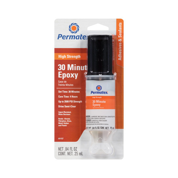 Versatile, Easy-To-Use, Multi-Purpose Epoxy Adhesive For Metals, Fabric, Fiberglass, Glass, Rubber, Concrete And Most Plastics. When Cured, Can Be Drilled, Sanded, Threaded Or Filed. Resistant To Fuels And Solvents. Resists Most Liquids. Great For Automotive Applications. Convenient 2-Part Dispensing Syringe. Fills Gaps And Bonds Trim. Use On Casting Cracks And Holes, Auto Trim And Ornaments. Sets In 30 Minutes. Permanent Strength Up To 3,500 Psi. Clear.