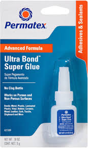 Permatex 21309 - Ultra Bond Super Glue.Sold Individually.Designed To Meet The Most Demanding Automotive Adhesive Needs, This Premium High Performance Super Glue Provides A Stronger, Faster-Acting And Longer Lasting Bond. Works On Porous And Nonporous Materials Including Metal, Most Plastics, Laminated Plastics, Vinyl, Rubber, Ceramics, Paper, Wood, Textiles, Leather, Synthetic Leather, Cork And Chipboard. Permanent, Transparent Bond Fills Gaps To.004€. Convenient 5 G Clog-Free Nozzle Bottle Keeps Fingers Glue-Free. Outperforms Regular Super Glues.Containes Chemical: Yes.Country Of Origin: Taiwan - Tw.