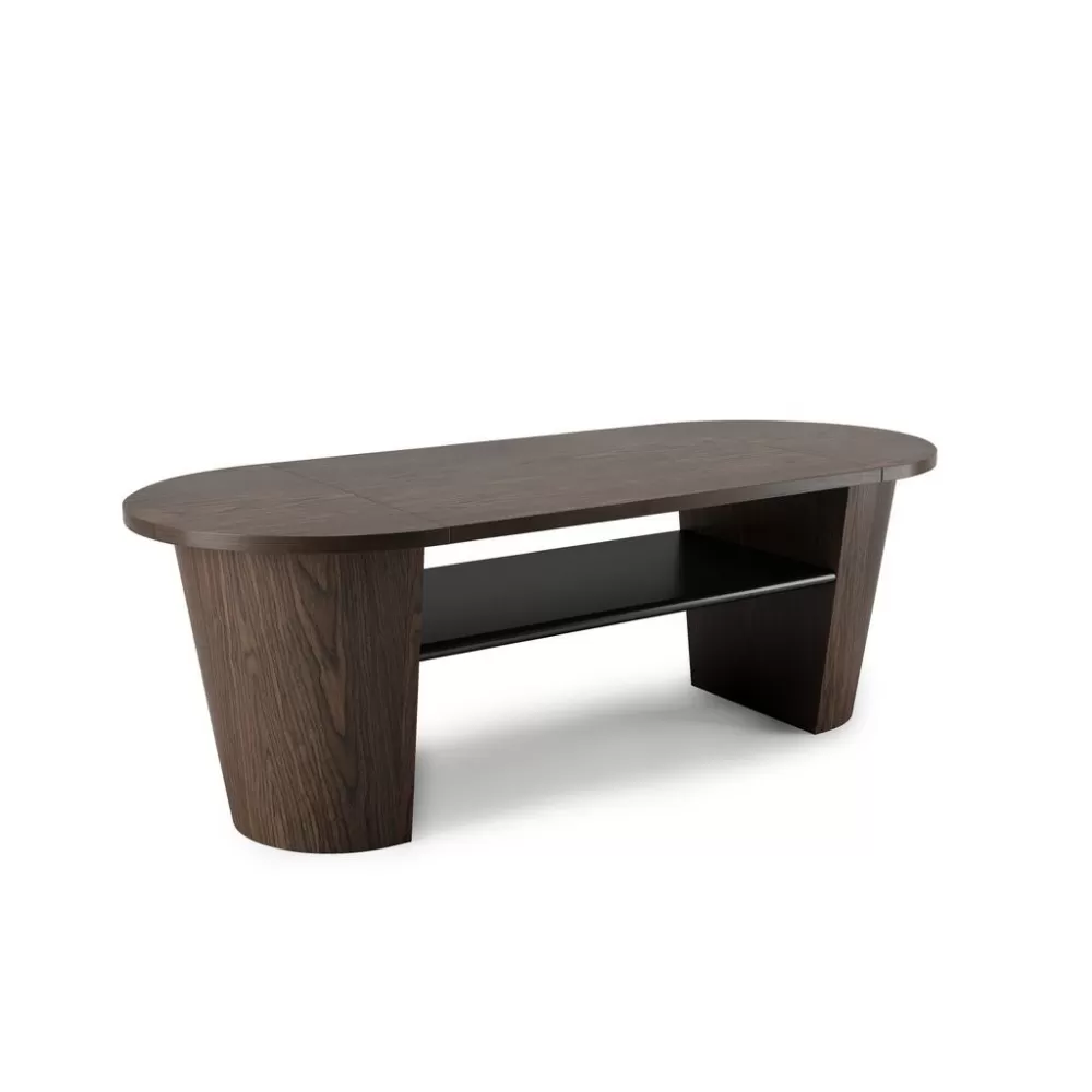 The WOODROW UMBRA coffee table is distinguished by its rounded corners (less dangerous for children) and its elegant dark shade, bringing a natural and trendy touch to your living space. Its unique design incorporates several hidden storage compartments at each end, and central shelf, perfect for organizing your magazines, remote controls, and other everyday items.