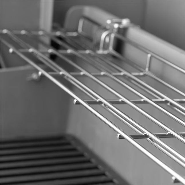 • Tuck-away warming rack keeps food warm, or toasts buns, while the main course finishes grilling on the grate; fold it down when not in use for easy storage